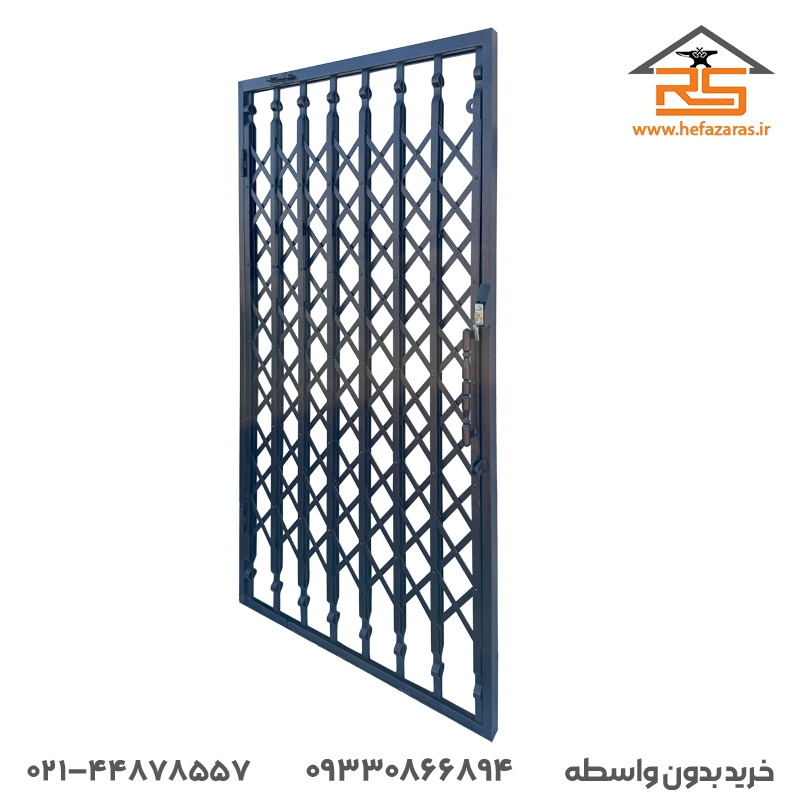 این حفاظ دارای سه ردیف تسمه عمودی ۵*۲۰ فابریک است که مقاومت آن را در برابر ضربه و فشار افزایش می دهد. همچنین، ریل بالا بلبرینگدار (ژاپنی) با ورق ۲میلیمتر خمکاری شده و ریل پایین نبشی۳ و تسمه۳سانت به شکل ناودانی از ویژگی های آن می باشد. استفاده از پرچ فولادی۵۰*۶میلیمتر با گل پرچ ۱۲ میلیمتر و کلاف چهارچوب ۶۰*۳۰(ضخامت ۲میلیمتر) نیز از دیگر ویژگی های این محصول است. فاصله تیرک ها ۱۲ سانتیمتر(استاندارد) بوده و از دو جفت حلقه آویز قفل و یک دستگیره طرحدار استفاده شده است. لولا سه پارچه ضد سرقت نیز از ویژگی های امنیتی این محصول می باشد.